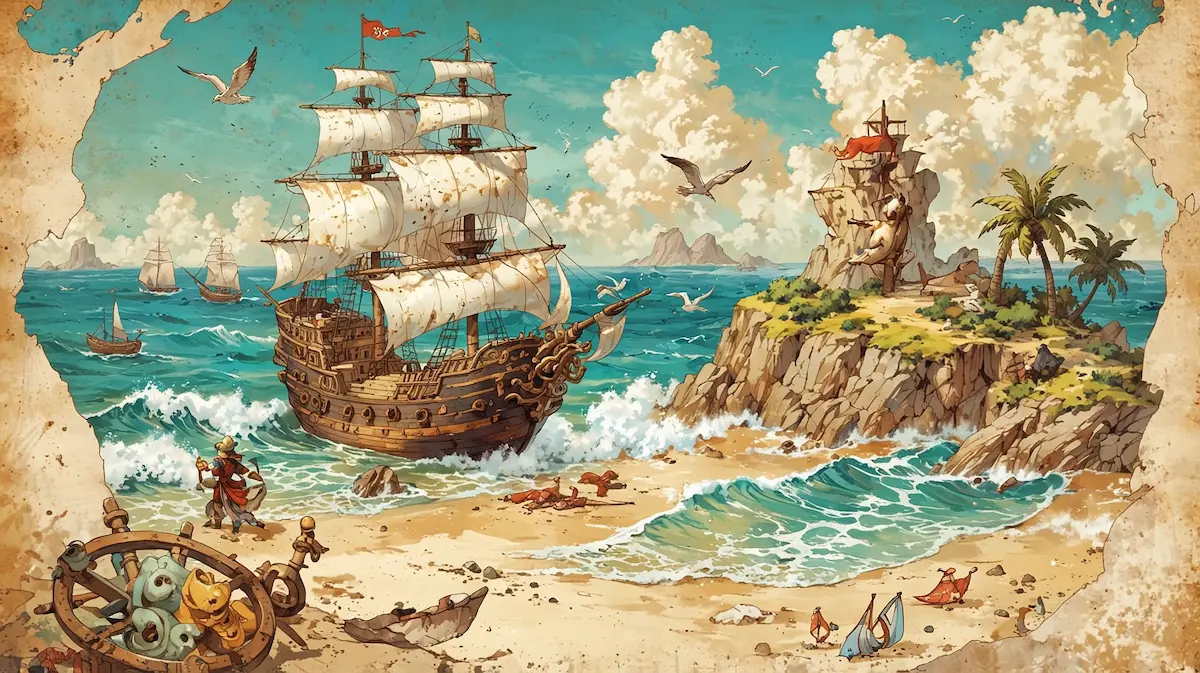 W końcu, po wielu dniach podróży, załoga dotarła do tajemniczej wyspy, gdzie według mapy miał być ukryty skarb. Wyspa była pełna egzotycznych roślin i zwierząt, a w powietrzu unosił się zapach przygody.